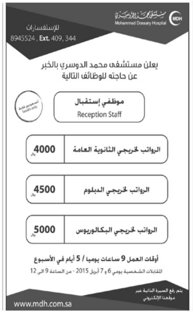 مستشفى محمد الدوسري في الخبر وظائف استقبال رواتب من 4000 حتى 5000 حسب المؤهل